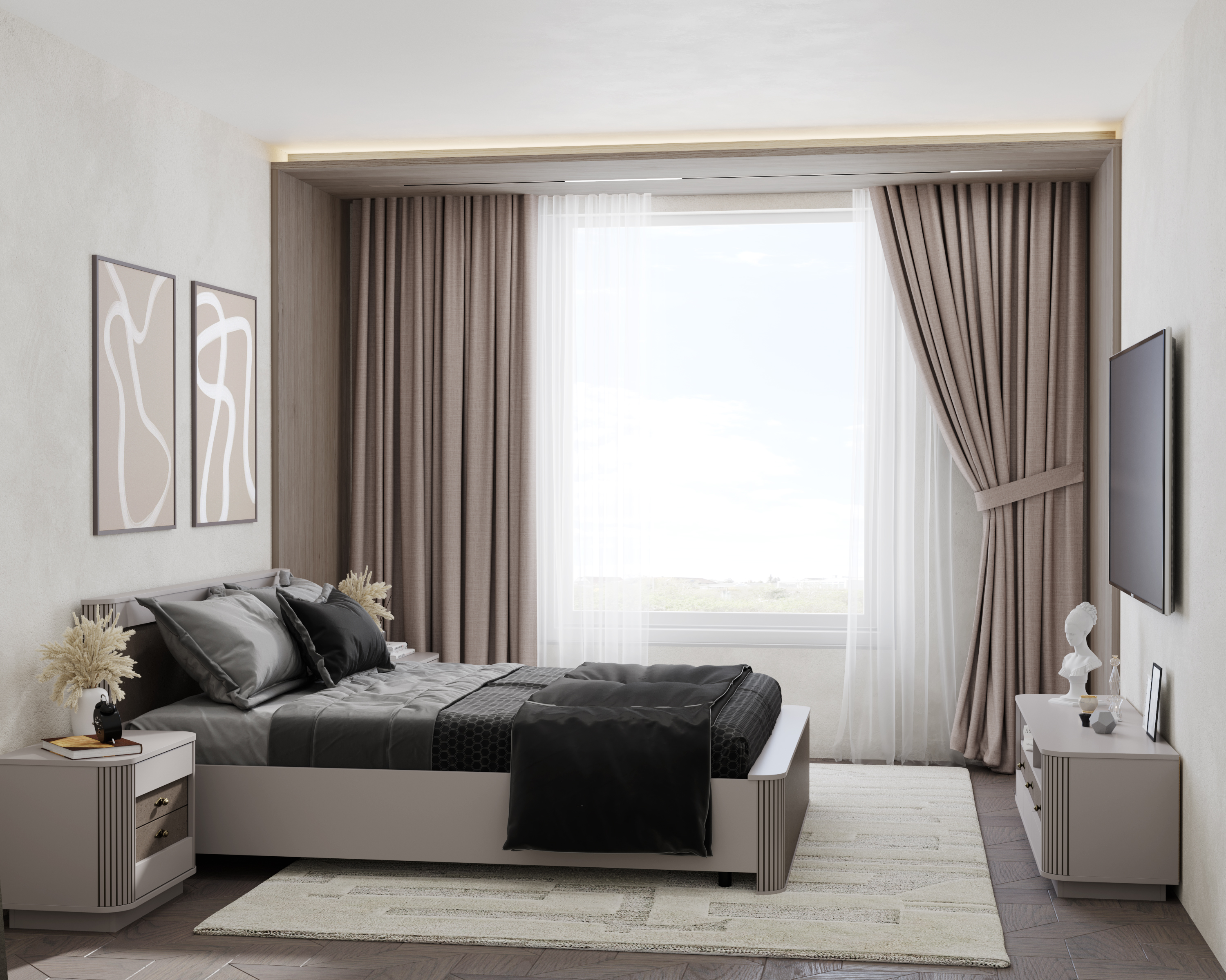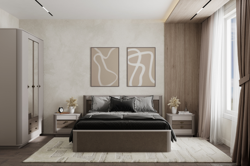 Лучшим решением для спальной комнаты является специальный мебельный комплект, состоящий из большой двухместной кровати, прикроватных тумбочек и плательного шкафа или мебельной стенки, шкафа-купе. Часто спальня украшается трюмо с зеркалом, косметическим столиком. Здесь также можно поставить кресло-качалку, пуфики, комод.